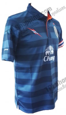 เสื้อแข่ง AFC บุรีรัมย์ยูไนเต็ด Buriram United ฤดูกาล 2014-2015 สีฟ้าลาย ใหม่ ล่าสุด เนื้อผ้าอย่างดี สกรีนธงชาติรูปสายฟ้า มีสปอนเซอร์ Chang ขนาดเล็กตรงกลางเสื้อ ด้านคอสกรีน Buriram United