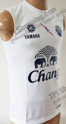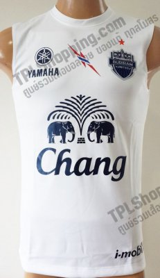 เสื้อซ้อมแขนกุดสโมสรบุรีรัมย์ ยูไนเต็ด ปีฤดูกาล 2014-2015 สีขาว เนื้อผ้าไมโครอย่างดี อกด้านขวาสกรีน Yamaha กลางหน้าอกด้านบน สกรีนสายฟ้าเป็นธงชาติไทย ด้านล่างเป็น Chang ด้านหลังประกอบด้วยสปอนเซอร์ CP, Amari, เมืองไทยประกันชีวิต และ CTH