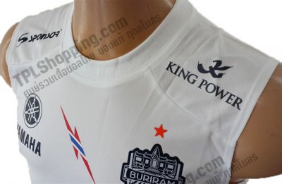 เสื้อซ้อมแขนกุดสโมสรบุรีรัมย์ ยูไนเต็ด ปีฤดูกาล 2015-2016 สีขาว เนื้อผ้าไมโครอย่างดี อกด้านขวาสกรีน Yamaha ที่ใหล่สกรีน Sponsor และ King Power กลางหน้าอกด้านบน สกรีนสายฟ้าเป็นธงชาติไทย ด้านล่างเป็น Chang ชายเสื้อสกรีน i-mobile ด้านหลังประกอบด้วยสปอนเซอร์ CP, Amari,เมืองไทยประกันชีวิต และ True